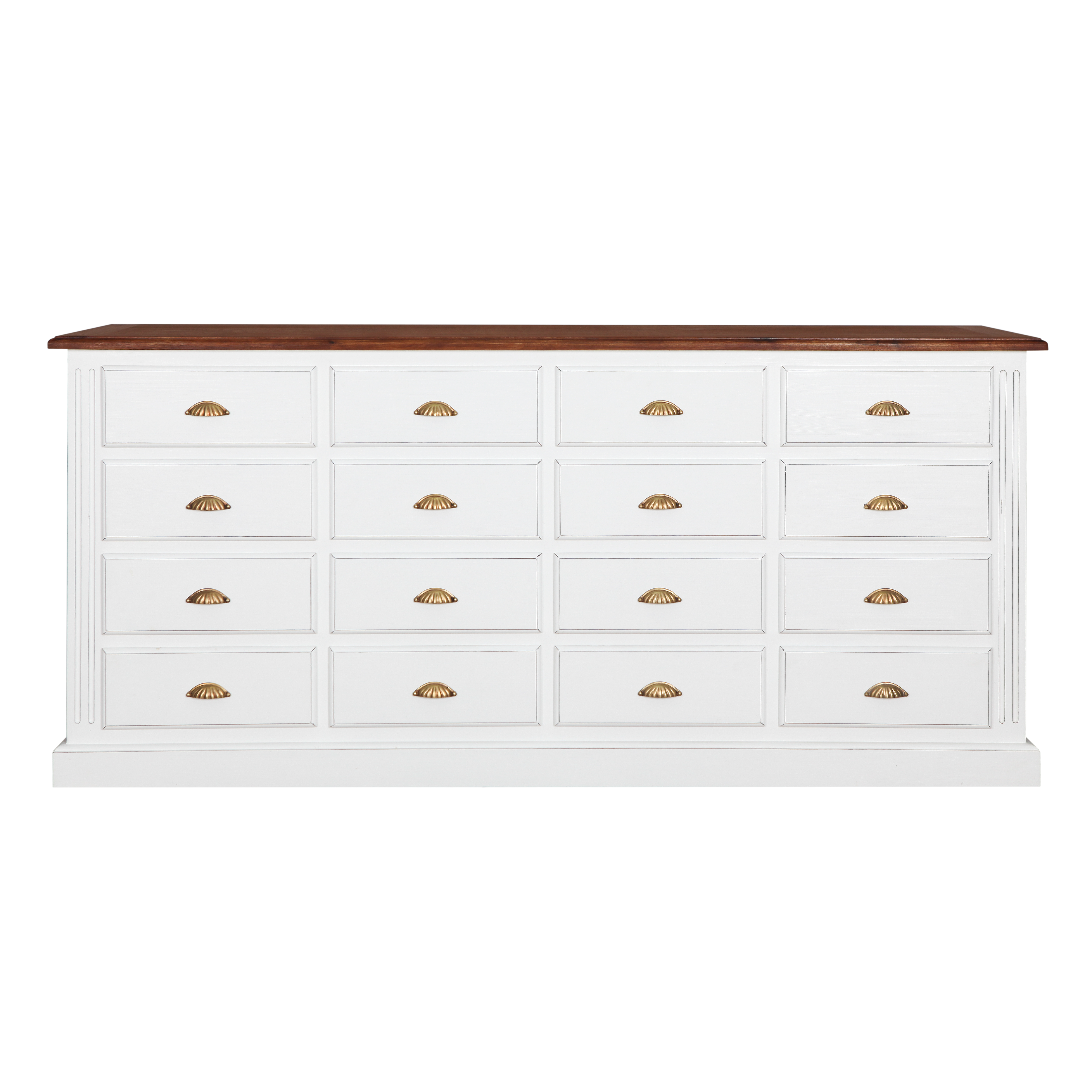 This ARTHUR Collection 16-drawer dresser has a timeless look and blends in easily with any decor. The classic lines are softened by the curved antique metal handles which add character and value to the furniture. The neutral, classic style makes it suitable for mens or womens, providing plenty of storage space in this attractive piece of furniture.