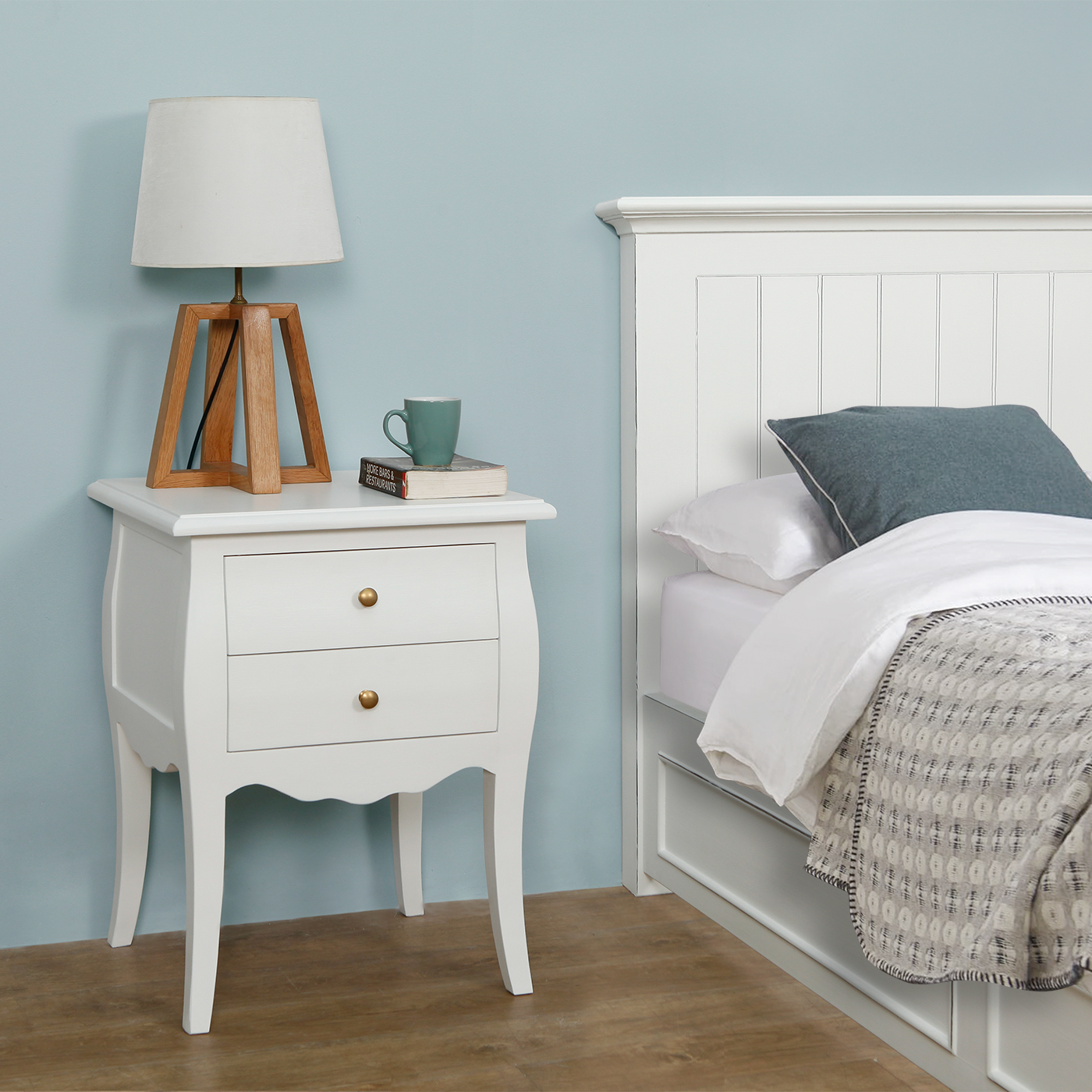 Elevate your bedroom decor with this FLORIE antique-style two-drawer nightstand by Decosy. Constructed with Acacia wood for enhanced durability, this nightstand sports a white finish and polished white drawers and legs for a charming French Country feel in your space.