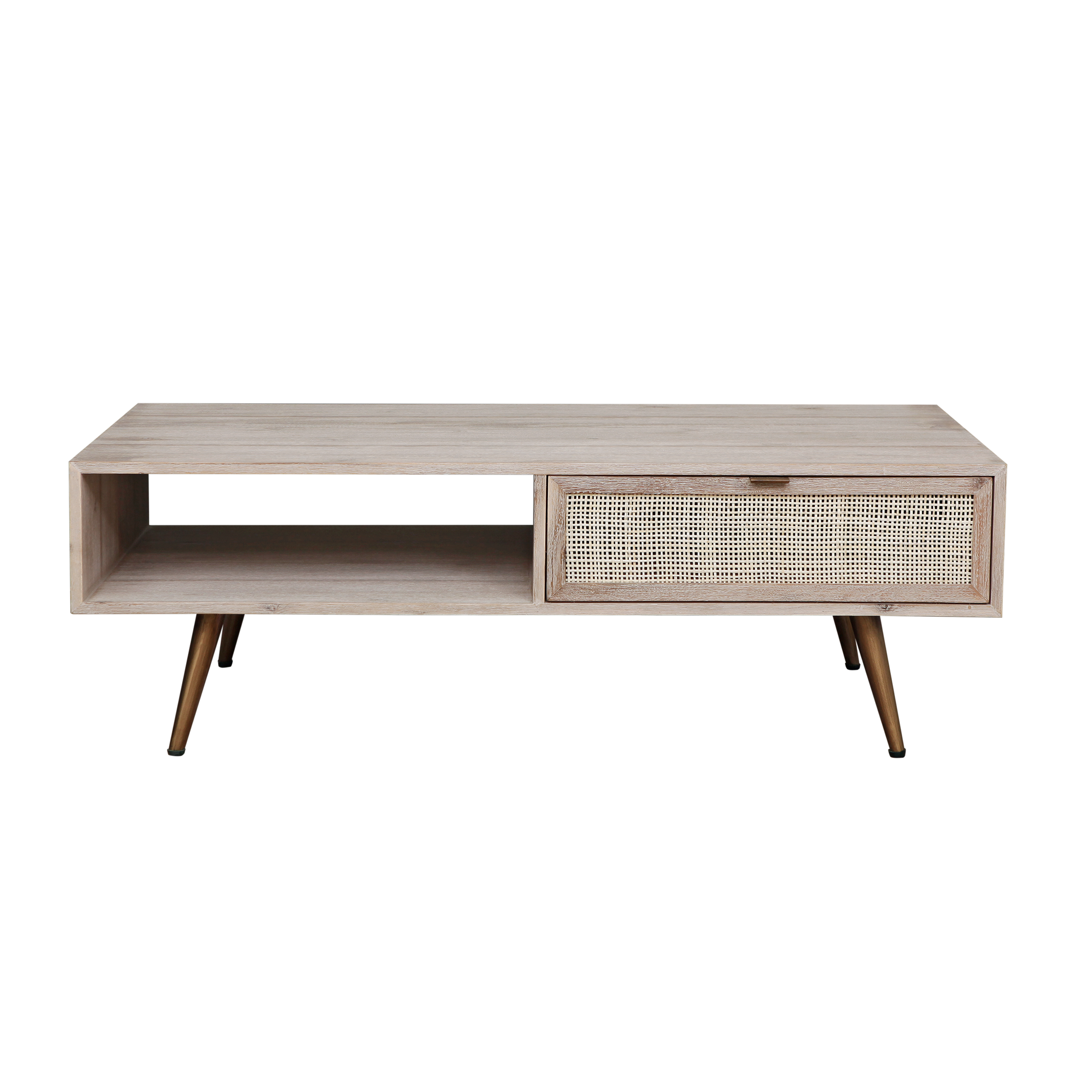 SPRING's Collection coffee table the perfect place to perch your coffee. Slim gold legs contrast the natural cane and whitened acacia finish. This coffee table's a modern-boho blend of materials at the best price. Ready to add it to your home ?