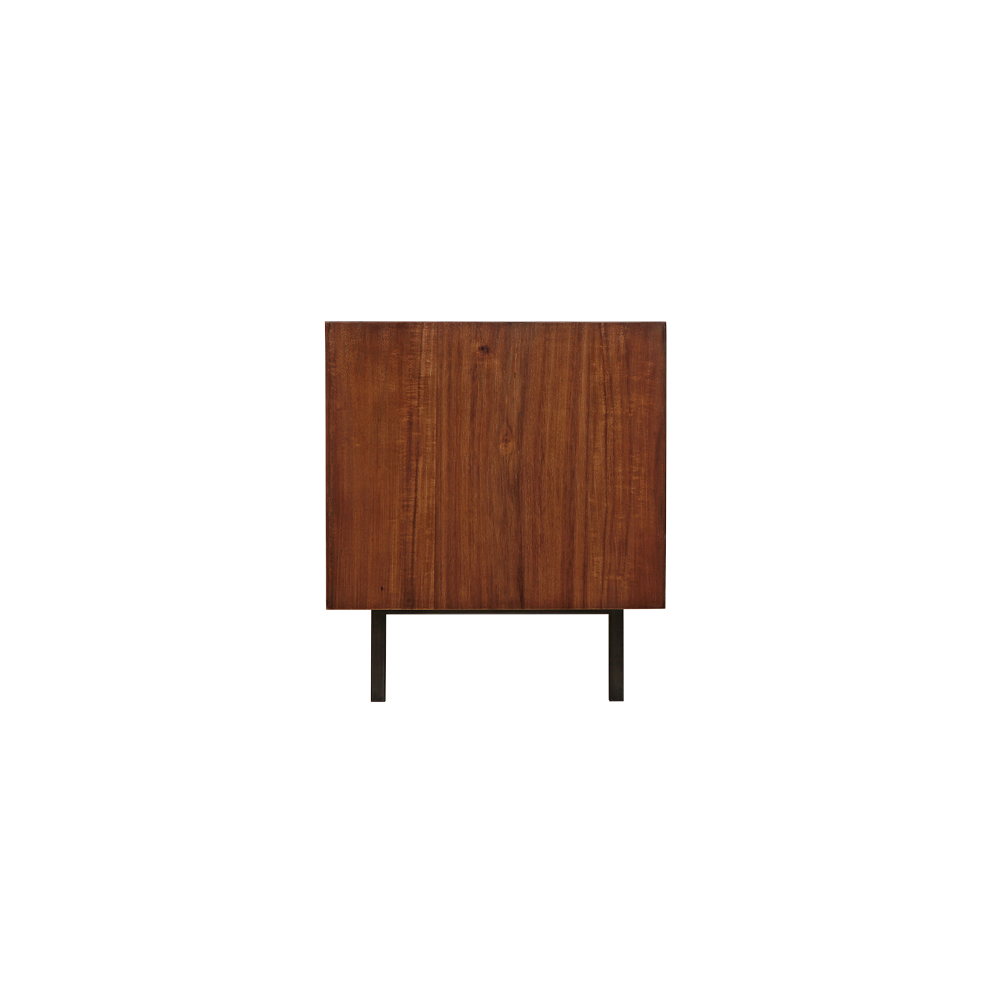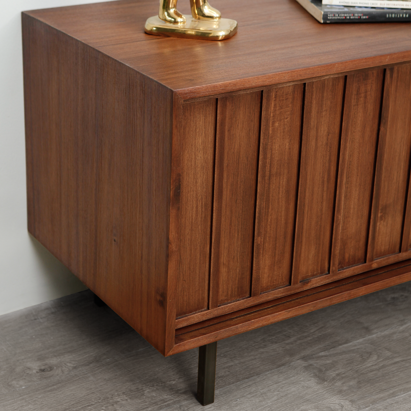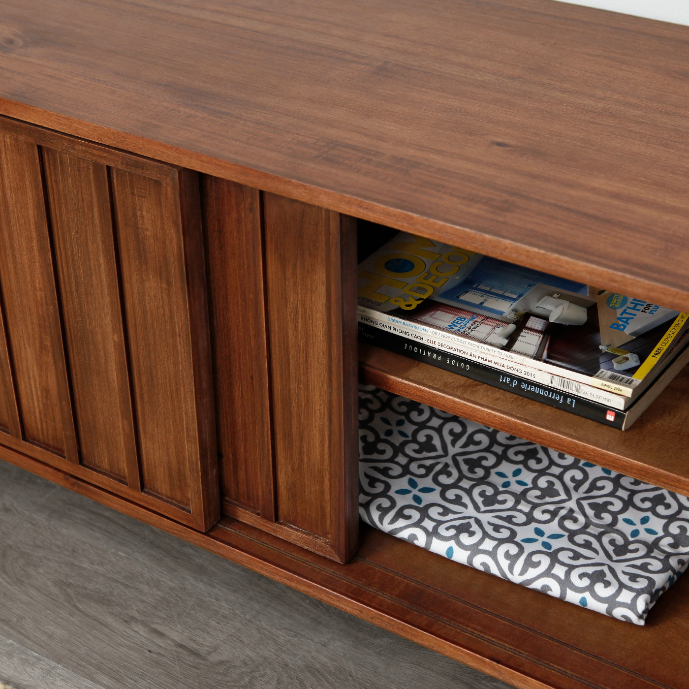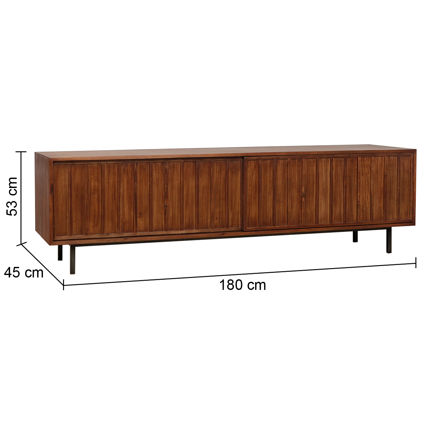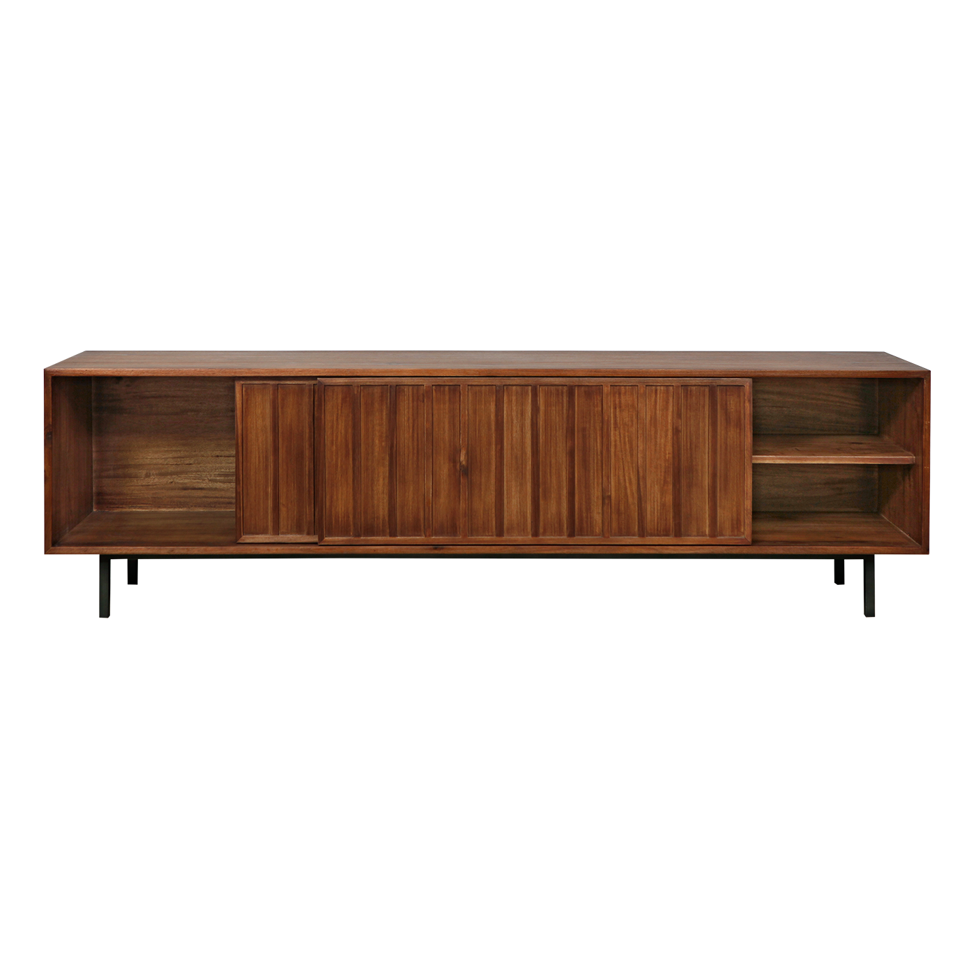 Brimming with modern style, this is a design lover's dream. The stand features a streamlined silhouette, two-tone colour palette, and eye-catching bracket legs. An exterior provides plenty of space for a media library, electronics, etc. The slidding doors help you keep everything tidy.