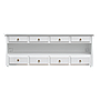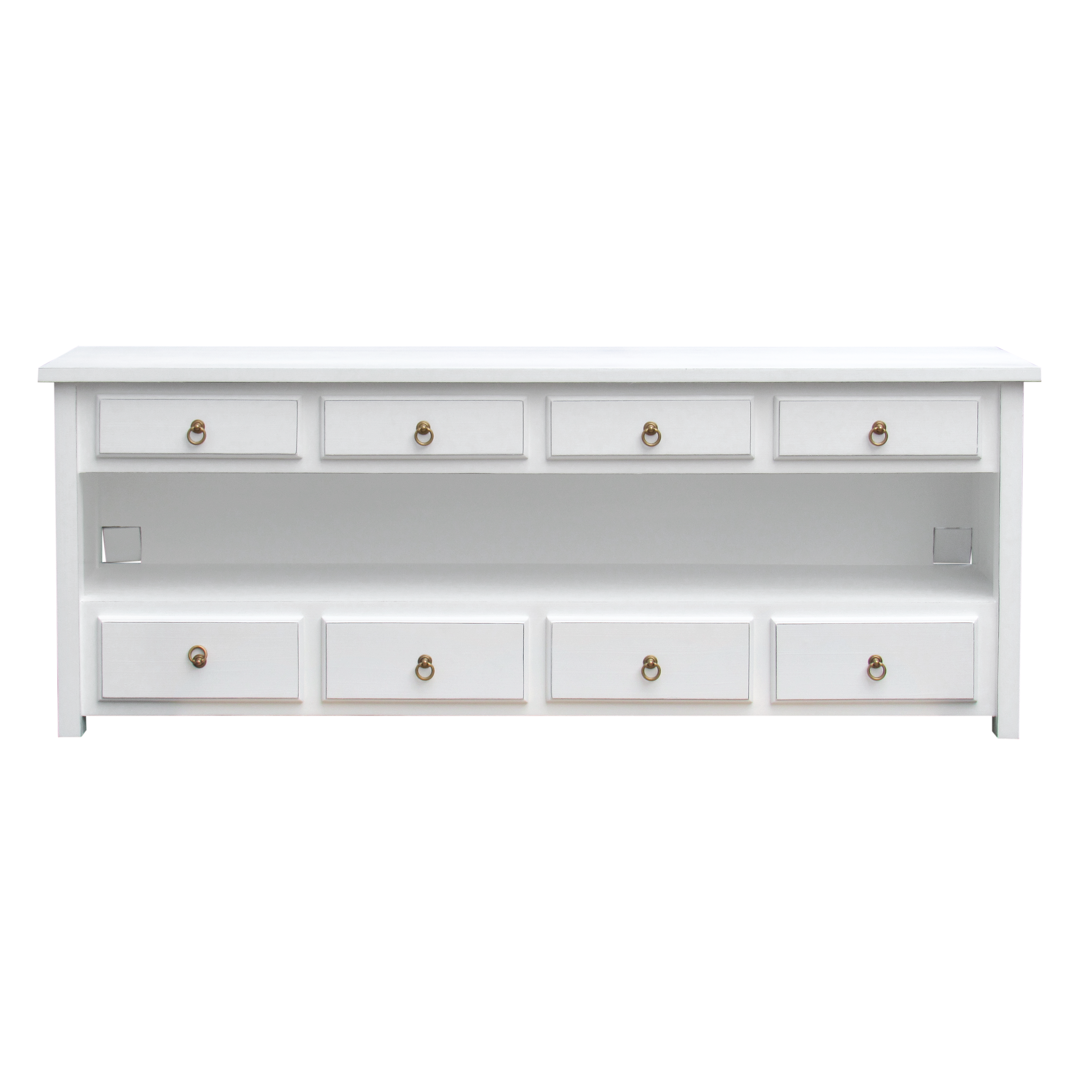 The television is always a favorite focal point in a living room, and this washed antic finished TV stand is sure to make it look extra attractive. Three layers cabinet, with two lines of four drawers, providing concealed storage space for entertainment essentials. One open shelve in the center feature wire management slots in the back to keep cords from media consoles and DVD players from getting tangled. With stylish golden handles, this TV stand has a farmhouse inspired vibe that's perfect for a rustic style living room.