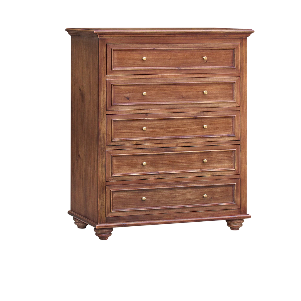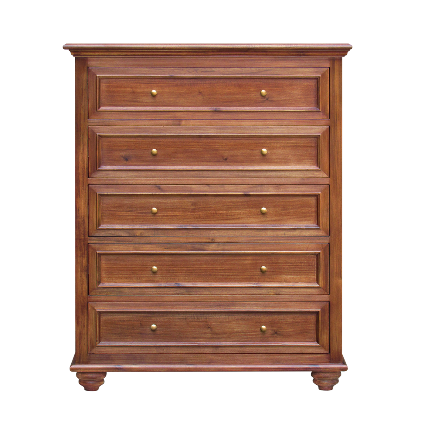 Keep your wardrobe clean, tidy and uncomplicated with this five-drawer chest from the MEGAN Collection. Constructed of solid acacia, this sturdy little number features a tray-style top to keep your jewelry, perfumes colognes and more conveniently at your fingertips and free from sliding off the edge. Four drawers will provide ample storage for all of your folded essentials!