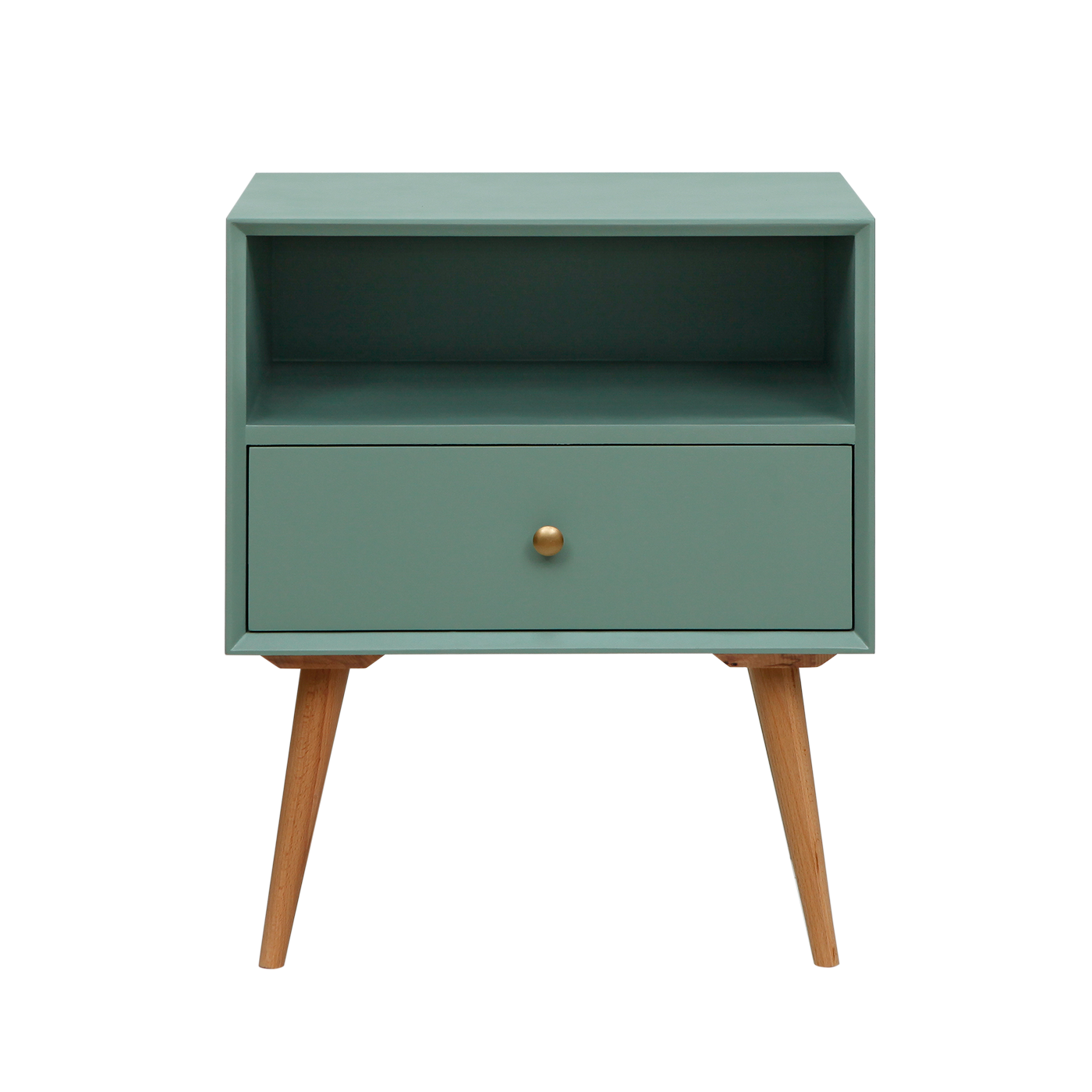 Bring a contemporary charm to your bedroom with this stylish bedside unit. Featuring one pull-out drawers on smooth runners, you can keep all of your bedroom bits and pieces close by and in easy reach of your bed. The legs are crafted in beerch wood, whilst the clean mint frame and drawer make a modern contrast.