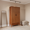 This stylish bedside table combines functionality with a modern design, featuring two fluted wood drawers that add texture and elegance. The fluted drawer fronts create a sleek, linear pattern, offering ample storage for personal items while enhancing the table's aesthetic. Above the drawers, an open niche provides additional space for easy access to books, electronics, or décor. The table stands on rounded legs, which give it a sturdy foundation and a soft, curved appearance. Crafted from high-quality wood, this bedside table complements a variety of interior styles, making it a perfect addition to any bedroom.